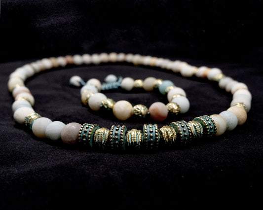 10mm Genuine Amazonite Beaded Necklace, Gold-Green, matching Bracelet | Meditation | healing stone | Bohemian | Tribal