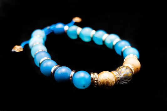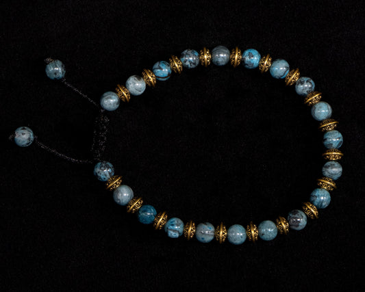 10mm Blue Agate, Gold Spacers, Glass gold center beads, Beaded Bracelet, Adjustable