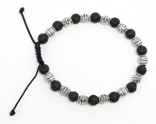 6mm Black Lava Genuine, Silver Tribal Spacer Beaded Bracelet | Adjustable | Unique | Natural | Meditation Crystal | Healing Stone | Bohemian