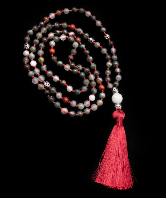 6mm African Bloodstone Mala with Red Tassel, White Jade Guru bead with silver spacers | Guru Beads | Meru | Meditation | Prayer bead | Malas