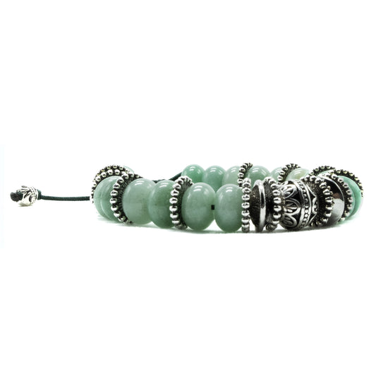 10mm Green Jade Rondelle with silver spacers and Silver main bead, beaded bracelet. Semi-precious gemstone. Adjustable