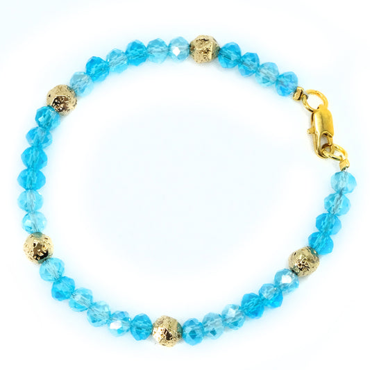 6mm Light Blue Glass Crystal with gold main beads and spacer beads, beaded bracelet. Gold clasp.