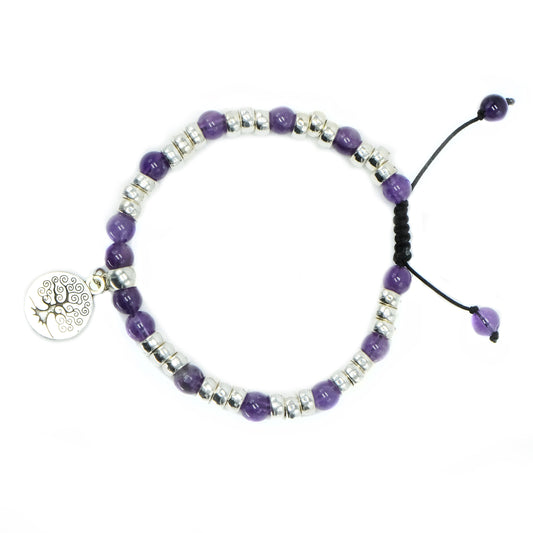 6mm Amethyst with Silver spacers and Tree Pendant beaded bracelet adjustable Semiprecious gemstone, Bohemian