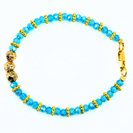 6mm Light Blue Glass Crystal with gold spacer beads, beaded bracelet. Gold clasp.