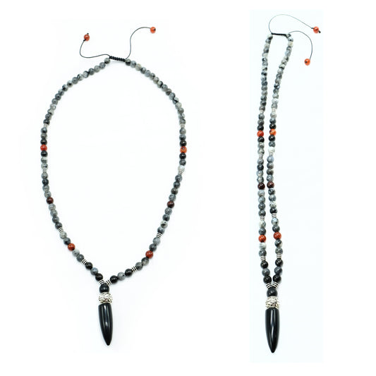 6mm Labradorite, Shungite, Red Agate beads with silver spacers and Obsidian main bead necklace | Natural, Adjustable, Bohemian