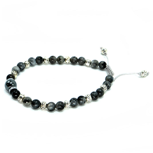 6mm Labradorite, Silver Obsidian and 8mm Hematite center bead, Beaded Bracelet, Adjustable, Bohemian