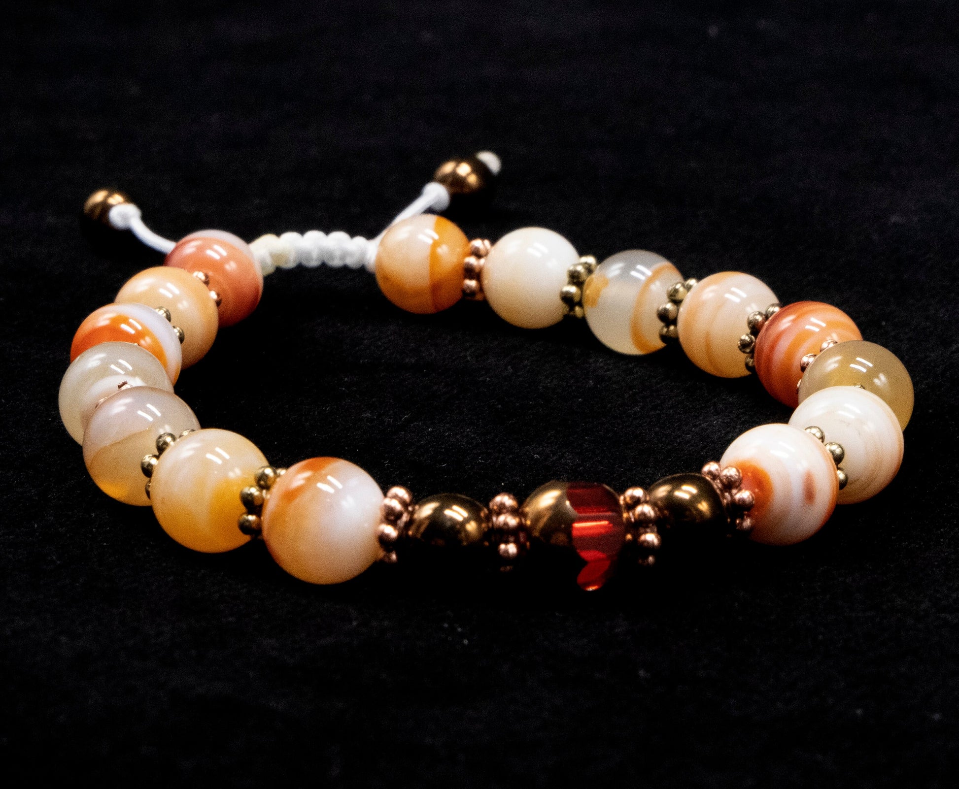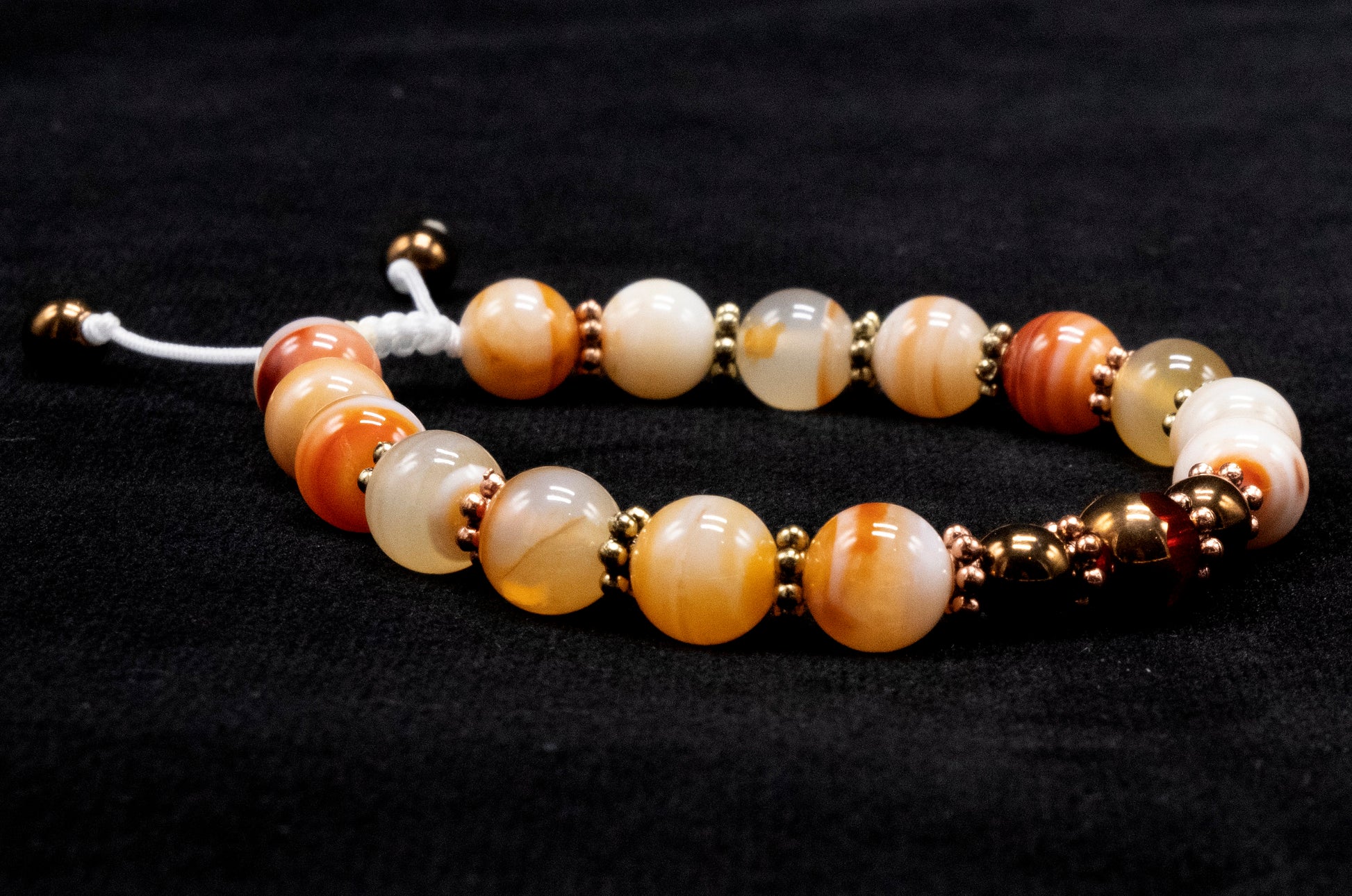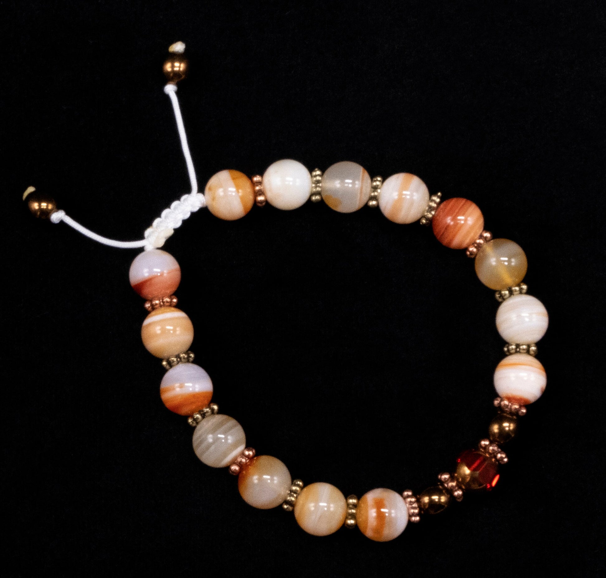 8 mm Agate with Red/Copper Glass Center bead with Copper Spacer Beaded Bracelet. Adjustable sizing.