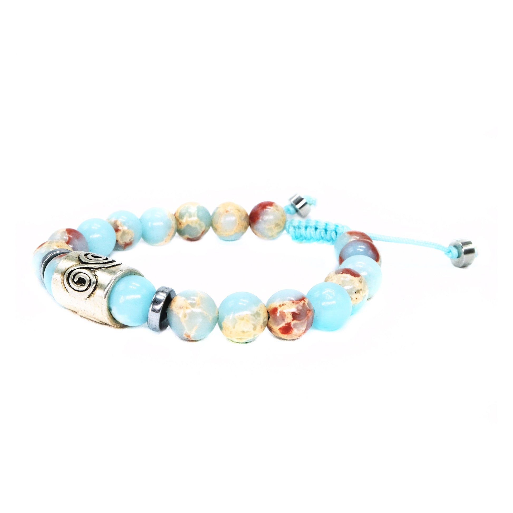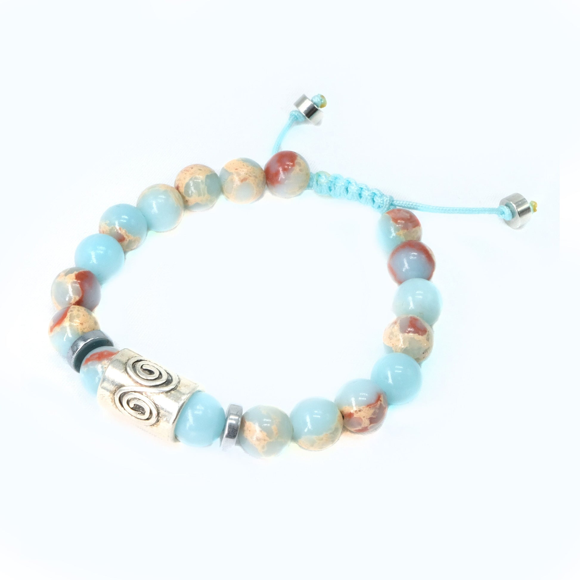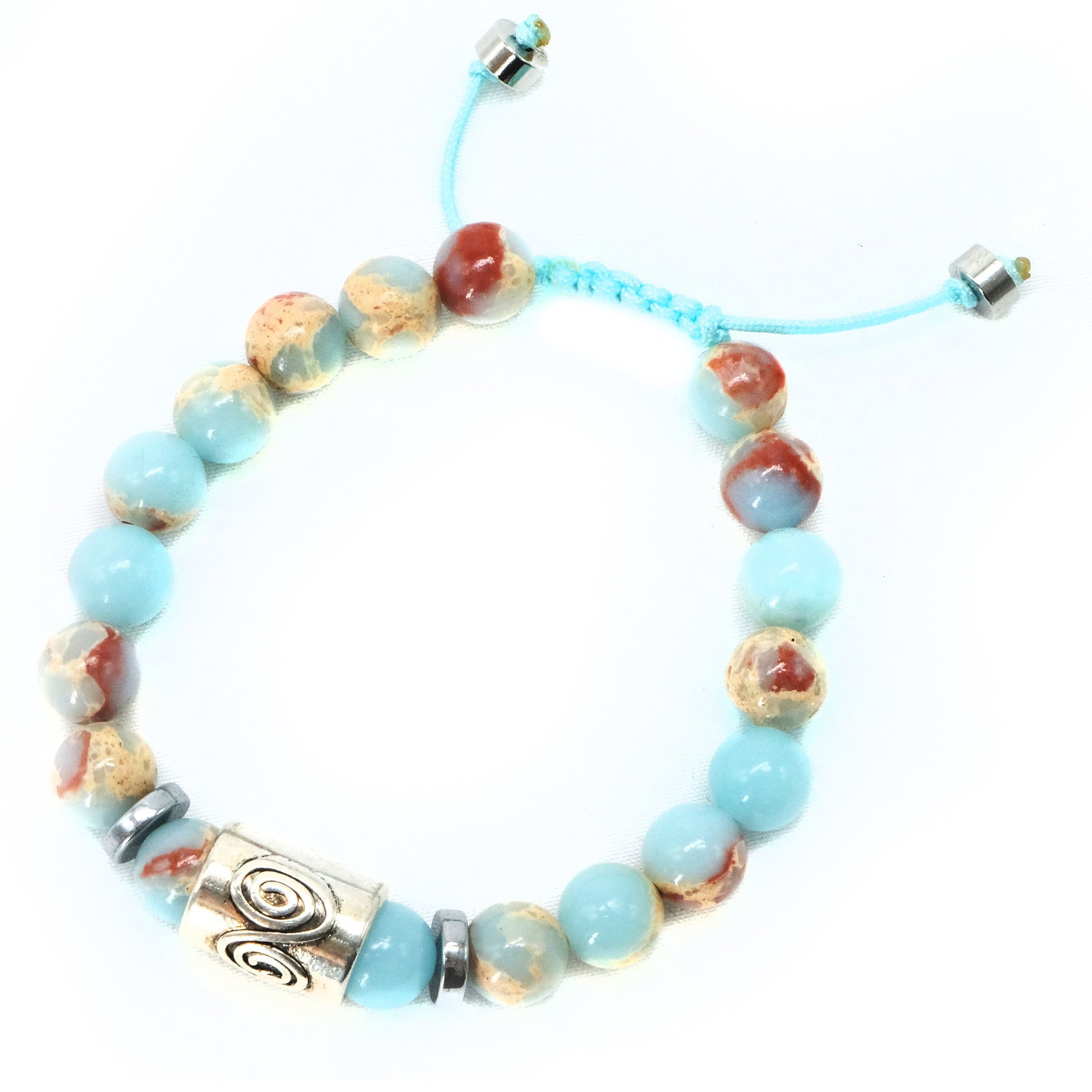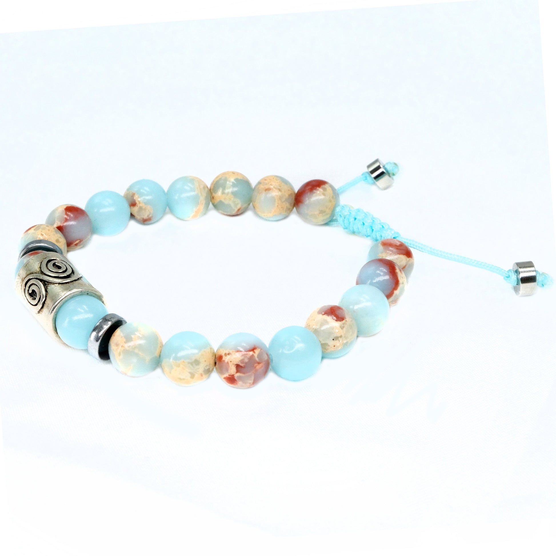 8 mm Sea Sediment Jasper beaded bracelet with silver main bead and spacer beads. Adjustable sizing.