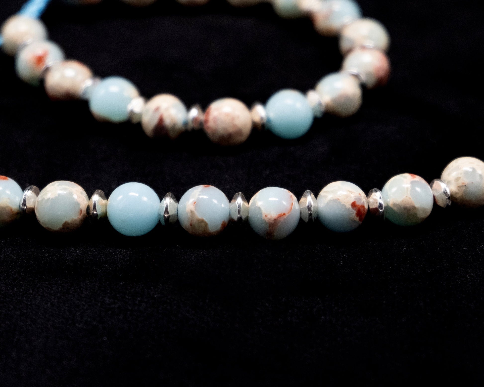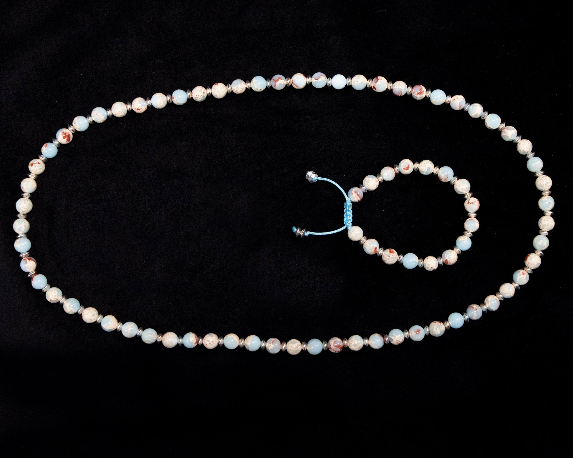 8 mm Sea Sediment Jasper beaded necklace and bracelet with silver spacer beads. Adjustable sizing.