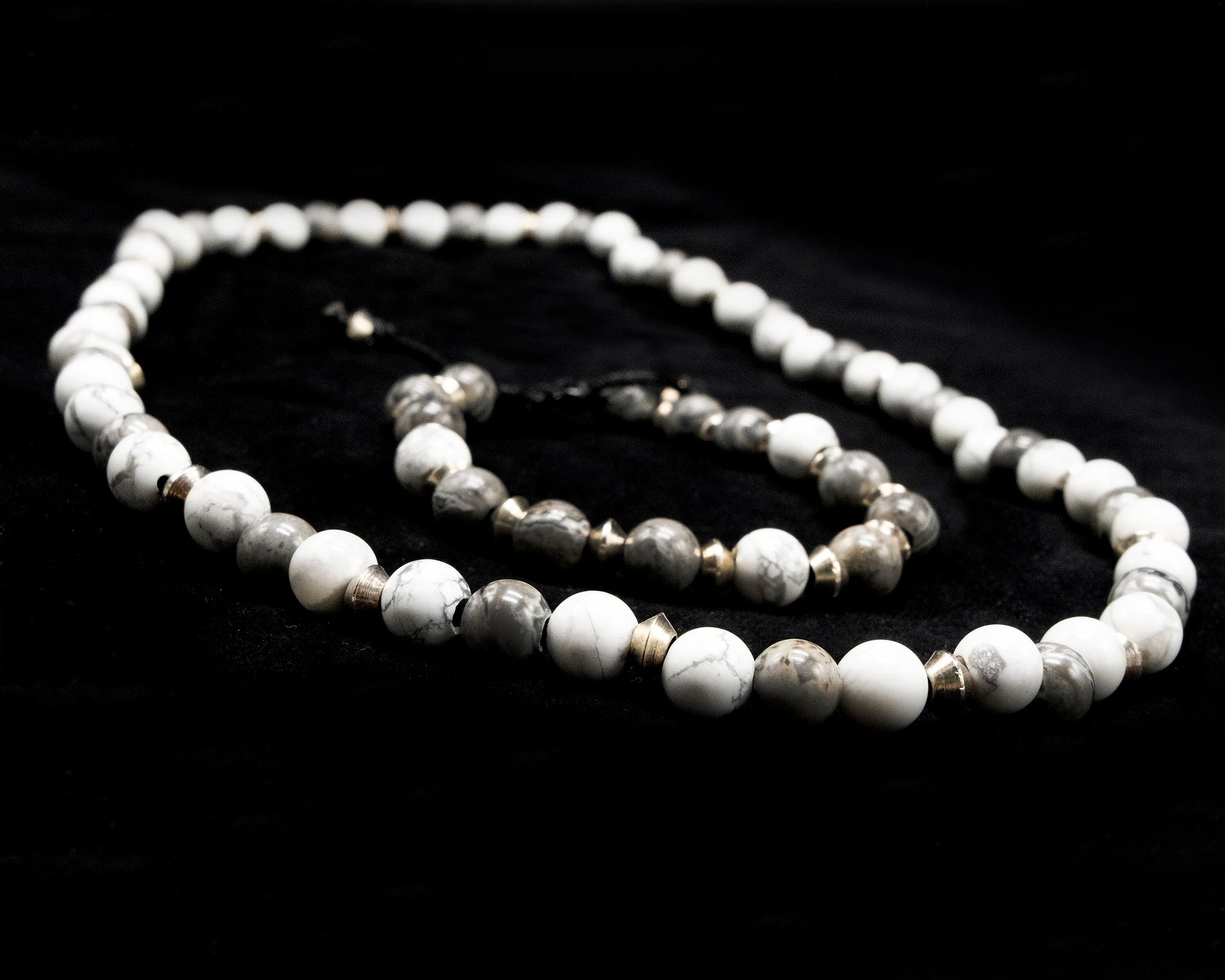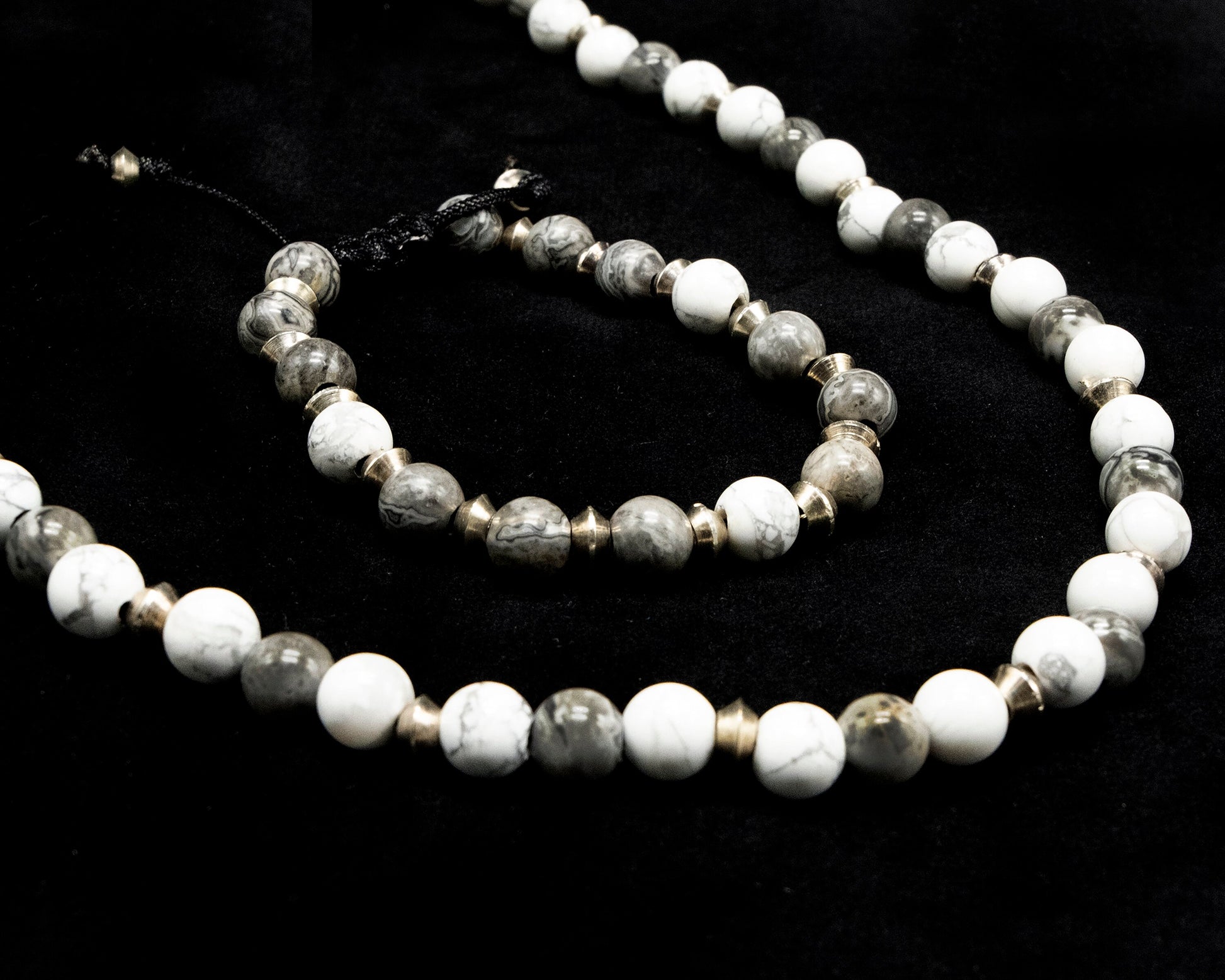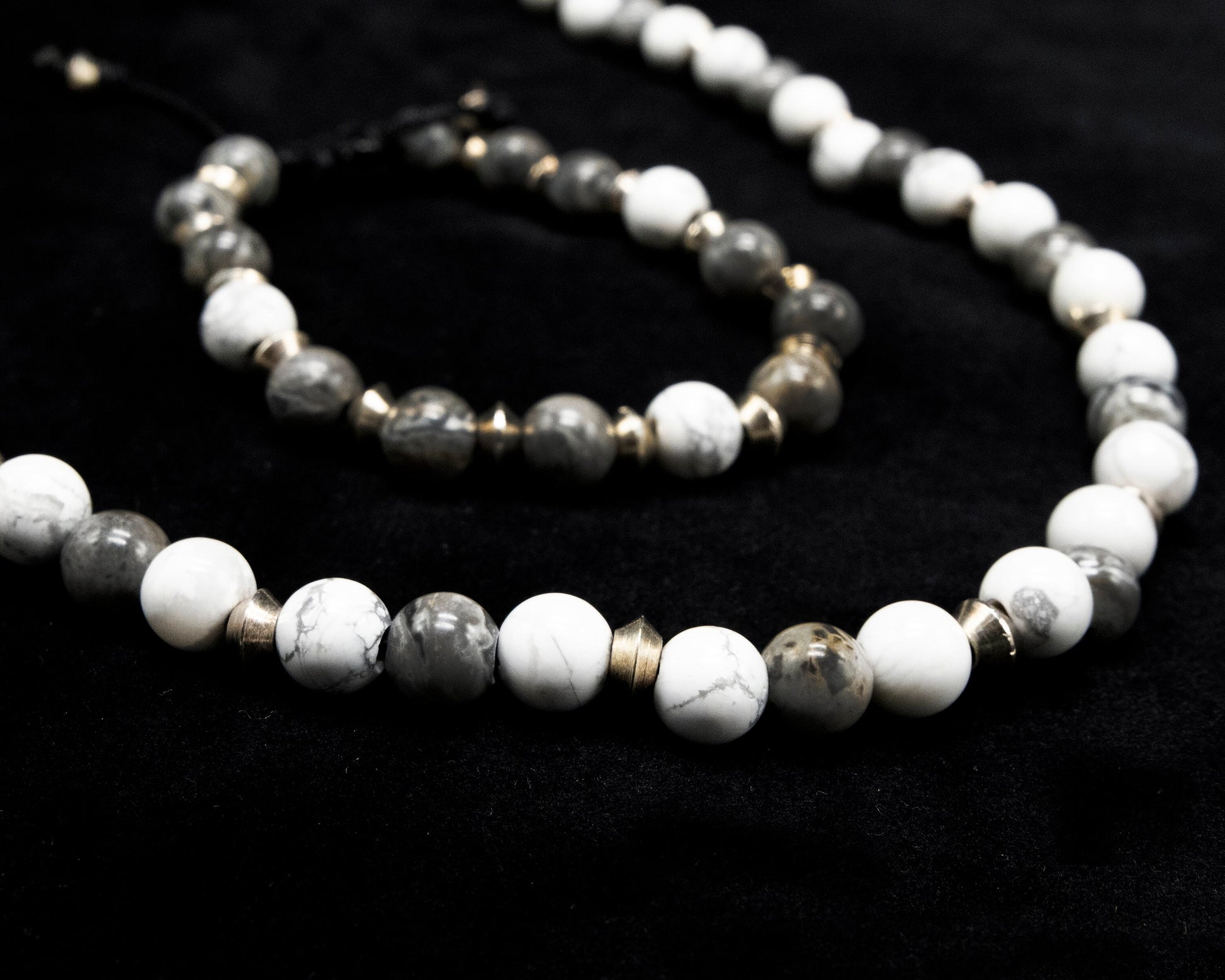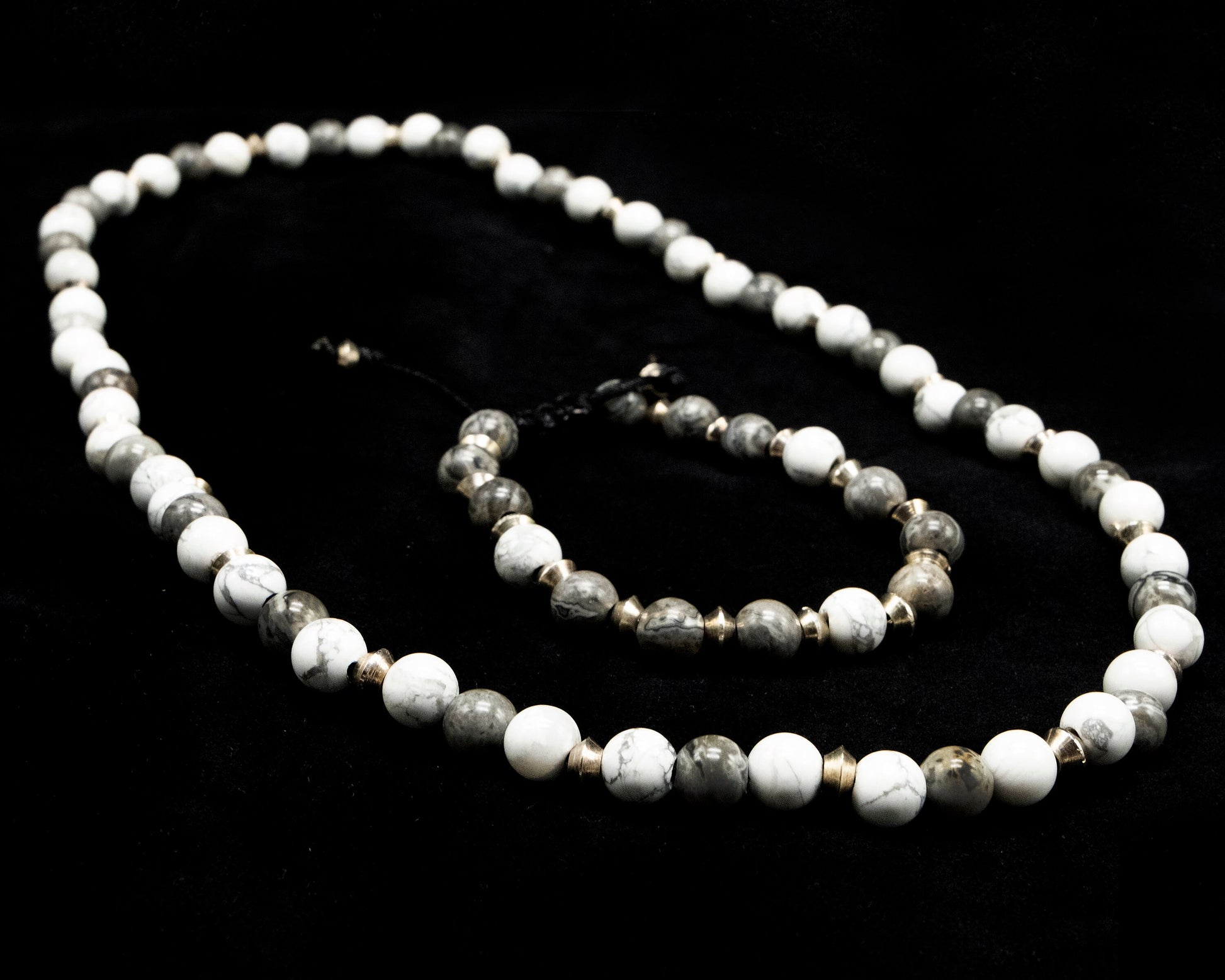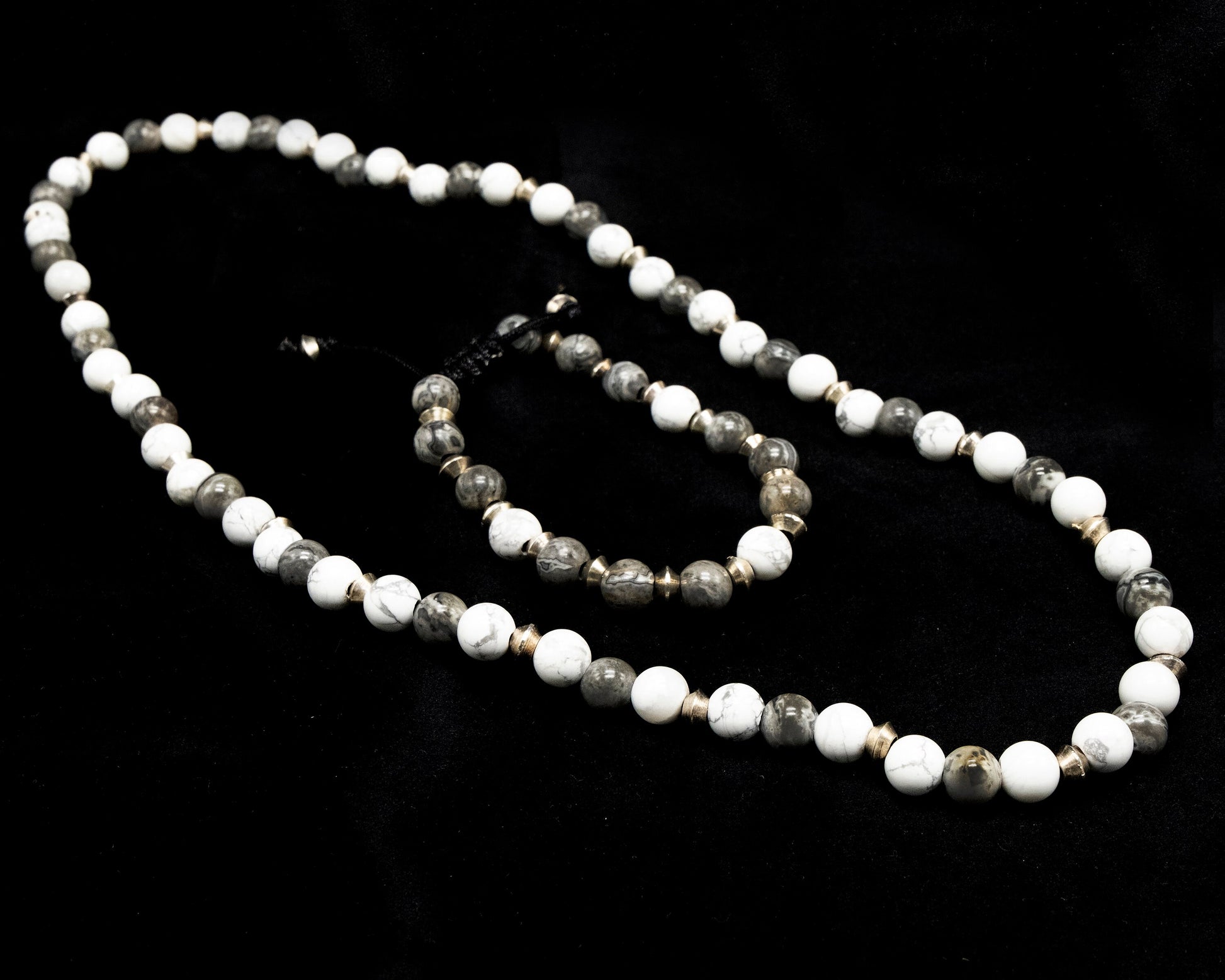 8mm White and Gray Howlite Necklace and Bracelet with Silver spacer beads. Adjustable sizing.